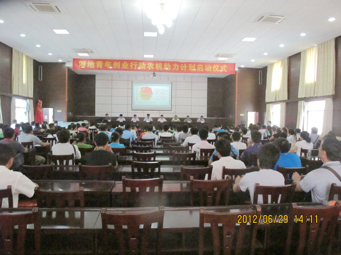 2012年6月29日,河池團(tuán)市委在宜州市舉行青年創(chuàng)業(yè)行動農(nóng)機助力活動啟動儀式。河池團(tuán)市委副書記黃澤同志、宜州市人民政府副市長藍(lán)吉陽同志、桂林高新區(qū)科豐機械有限責(zé)任公司銷售總監(jiān)楊毅民同志等領(lǐng)導(dǎo)出席會議。宜州團(tuán)市委領(lǐng)導(dǎo)、市農(nóng)機局領(lǐng)導(dǎo)、各鄉(xiāng)鎮(zhèn)團(tuán)委書記或負(fù)責(zé)人、各村(社區(qū))團(tuán)支部書記、科豐公司農(nóng)機經(jīng)銷商代表、創(chuàng)業(yè)青年代表近200人參加活動儀式。