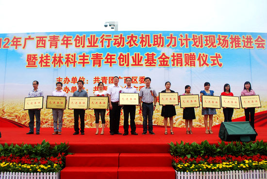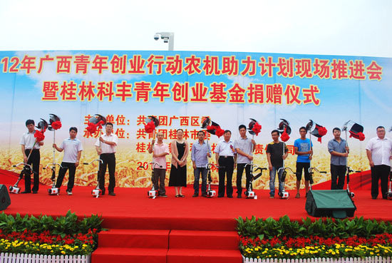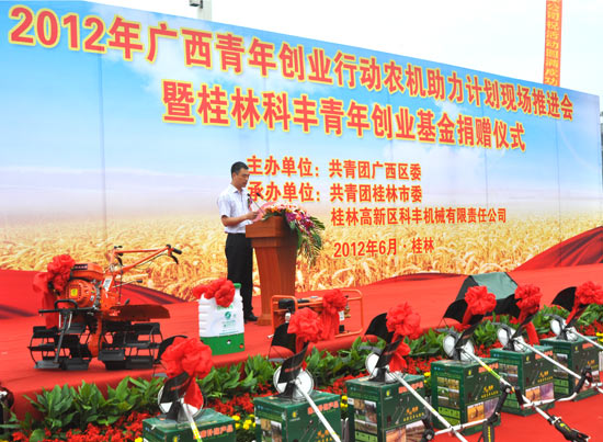 6月12日上午,2012年廣西青年創(chuàng)業(yè)農(nóng)機(jī)助力計(jì)劃現(xiàn)場推進(jìn)會(huì)暨桂林科豐青年創(chuàng)業(yè)基金捐贈(zèng)儀式在桂林市中心廣場舉行。共青團(tuán)廣西區(qū)委副書記嚴(yán)霜、桂林市人大常委會(huì)副主任魯圣發(fā)、共青團(tuán)廣西區(qū)委農(nóng)村青年工作部副部長黃來煥、自治區(qū)農(nóng)機(jī)局科教處副調(diào)研員李秀姣、共青團(tuán)桂林市委書記石小松、桂林高新區(qū)科豐機(jī)械有限責(zé)任公司總經(jīng)理王軍平出席會(huì)議。參加活動(dòng)的還有全區(qū)其他13個(gè)地市的團(tuán)委領(lǐng)導(dǎo)和代表、桂林市各縣(區(qū))團(tuán)委代表、獲獎(jiǎng)基層團(tuán)組織代表、創(chuàng)業(yè)青年代表。活動(dòng)由團(tuán)市委副書記魏艷主持。