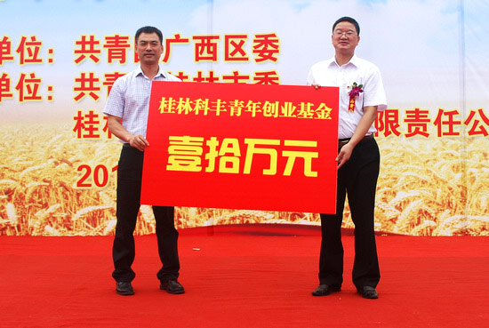 活動(dòng)儀式上,科豐公司向“桂林科豐青年創(chuàng)業(yè)基金”捐贈(zèng)首筆10萬元資金,用于幫助基層團(tuán)組織扶持農(nóng)村青年就業(yè)創(chuàng)業(yè)。